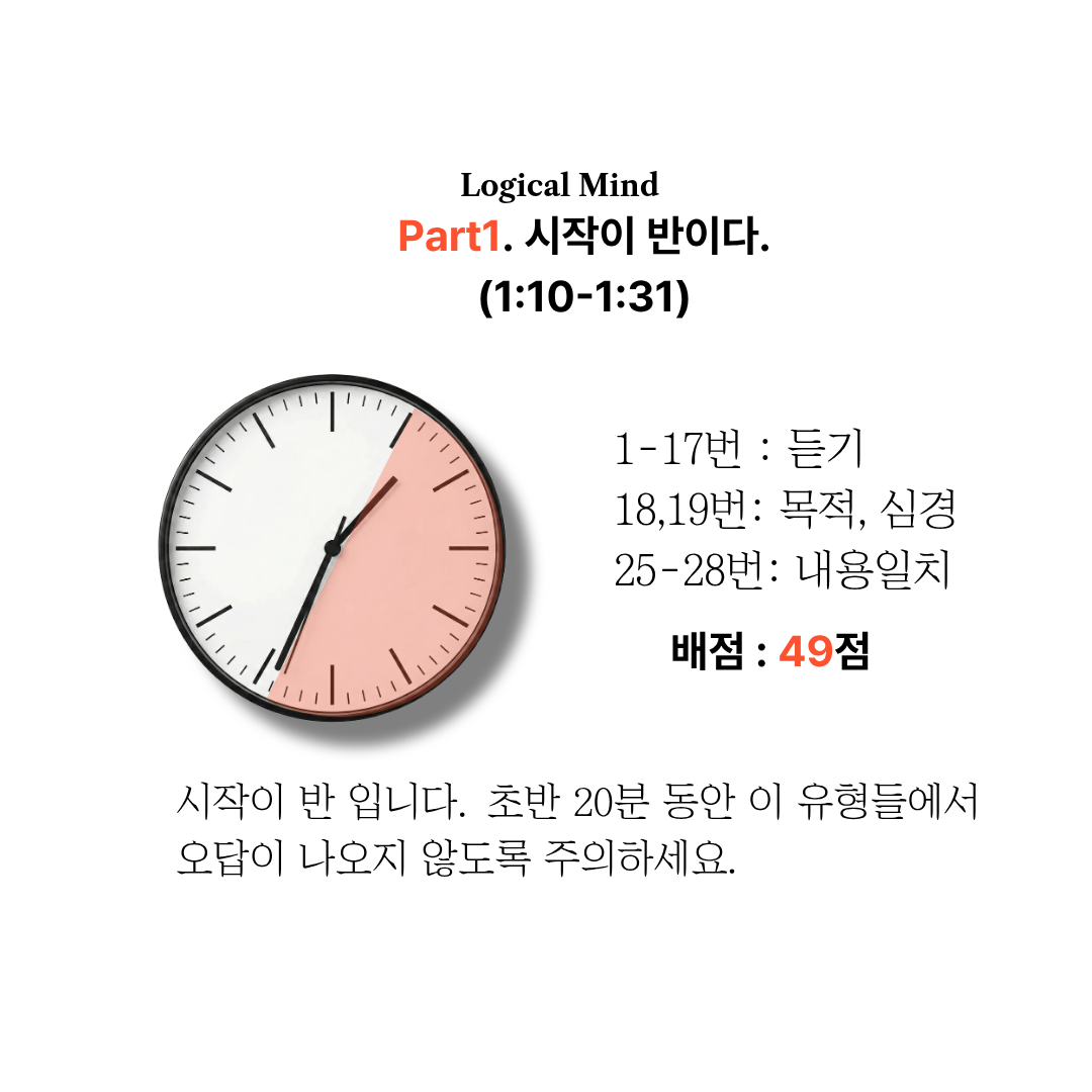 Part 1의 목표는 1시 31분(듣기 종료)까지 안정 득점 구간을 마무리하는 것입니다. 이 구간은 배점이 49점입니다. 초반 49점을 안정적으로 확보하면, 뒤에서 시험 운영이 어렵더라도 60점 후반에서 70점 초반은 방어할 수 있습니다. 반대로 Part 1이 흐트러지면, 뒤의 고난도 문항들에서 정답이 나오더라도 70점을 벗어나기가 힘들죠.