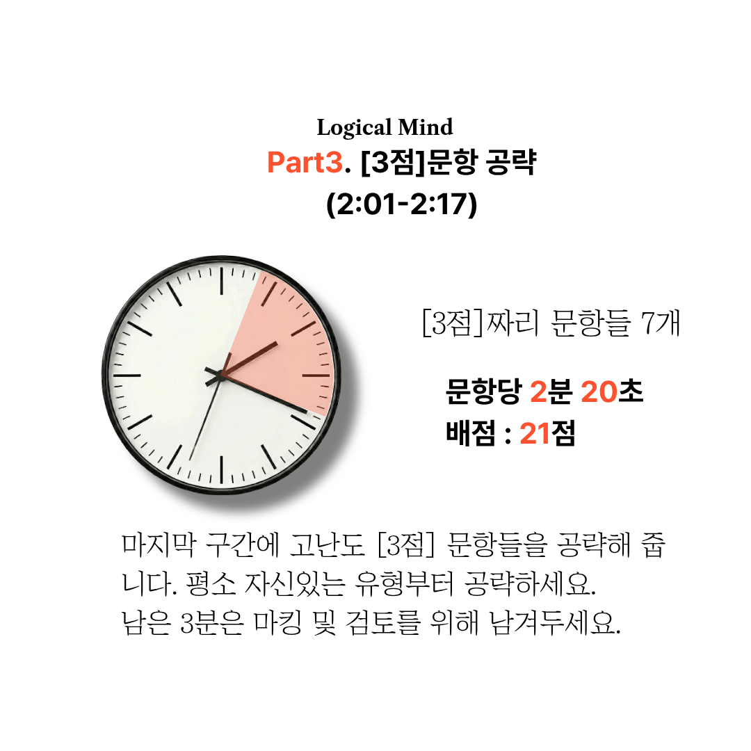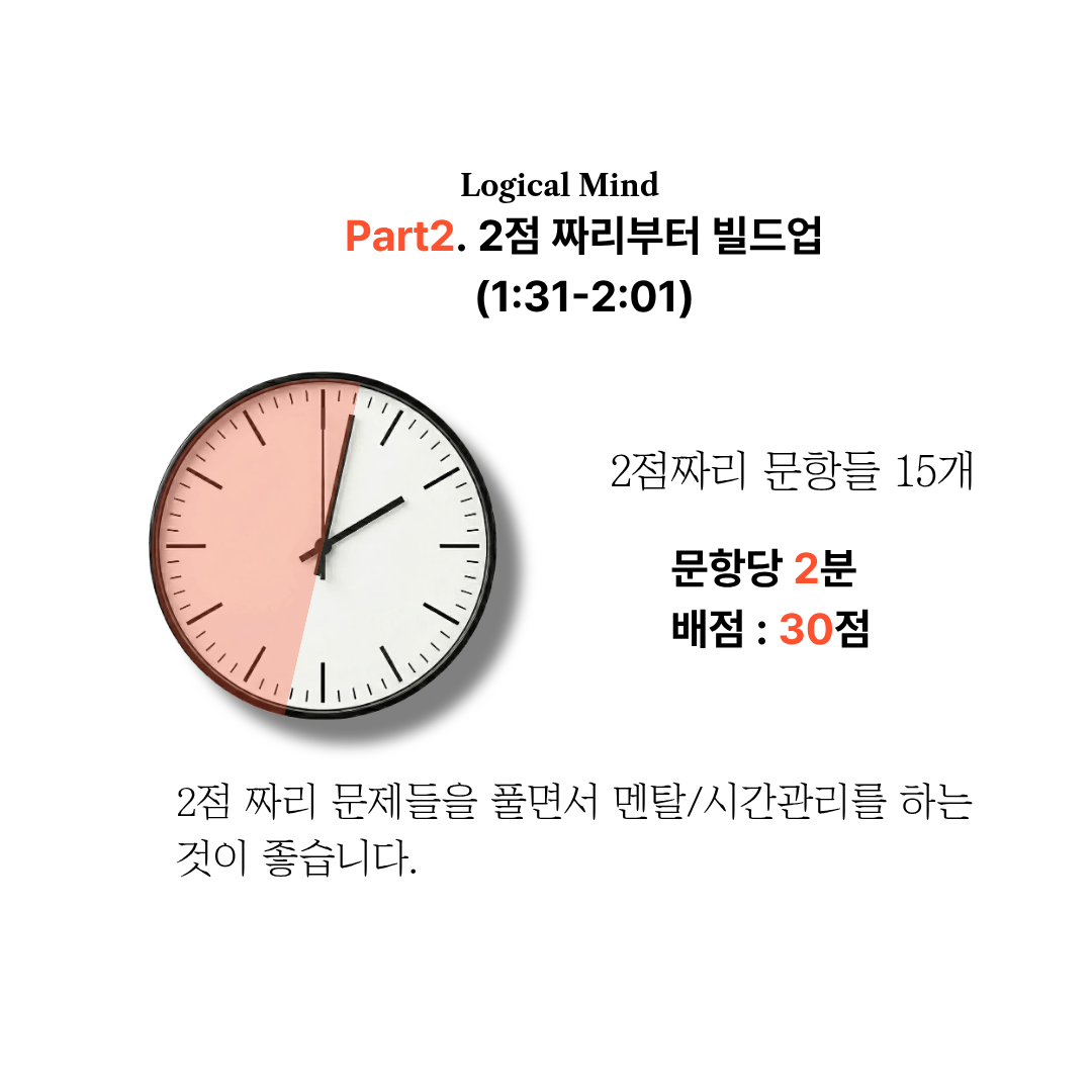 그래서 이 구간에서는 2점 문항을 문항별로 차근차근 처리하며 점수를 안정화시키는 구간으로 만드는 것이 좋습니다. 여기서 점수가 쌓이면 멘탈이 안정되고, 멘탈이 안정되면 Part 3에서 필요한 결정을 더 정확하게 할 수 있습니다.